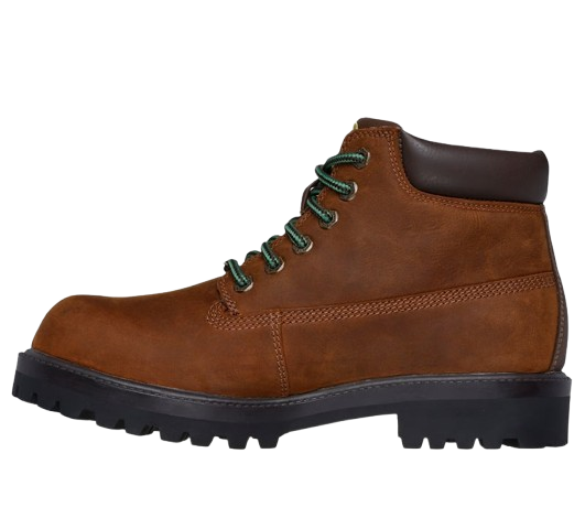 Cette botte de travail à lacets Relaxed Fit™ est dotée d’une tige en cuir imperméable avec un bracelet rembourré et d’une semelle intérieure coussinée Skechers Air-Cooled Memory Foam™.